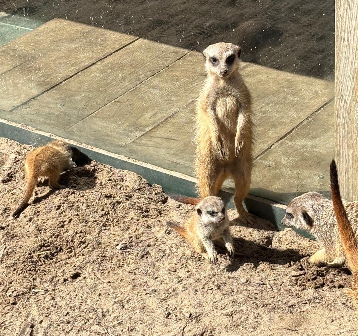 Op 6 maart jl. zijn er stokstaartjes geboren. De eerste periode verbleven ze nog lekker warm bij de moeder binnen in het verblijf, maar nu mogen ze naar buiten. Lekker ravotten!